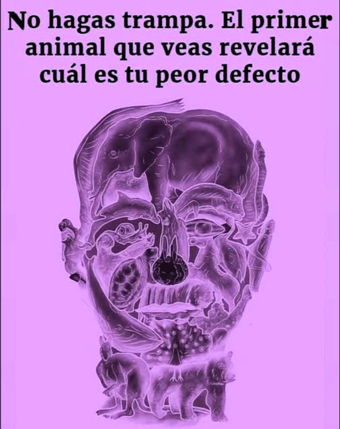 En redes sociales circula constantemente una imagen con múltiples animales ocultos, acompañada de la frase: “No hagas trampa. El primer animal que veas revelará cuál es tu peor defecto”. Se trata de una ilustración que, a simple vista, parece el contorno de un rostro humano, pero que esconde diversas figuras de animales superpuestas. Este tipo de pruebas visuales o “tests” se ha vuelto muy popular, pues despierta la curiosidad y el debate sobre si realmente pueden reflejar rasgos de la personalidad de quien las observa.