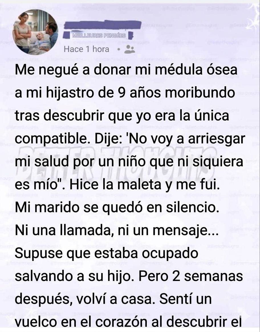Pensé que eso significaba que habían encontrado otra solución. Tal vez habían hallado otro donante. Tal vez los médicos estaban probando nuevos tratamientos. Tal vez mi marido estaba demasiado ocupado en el hospital como para preocuparse por mí.
